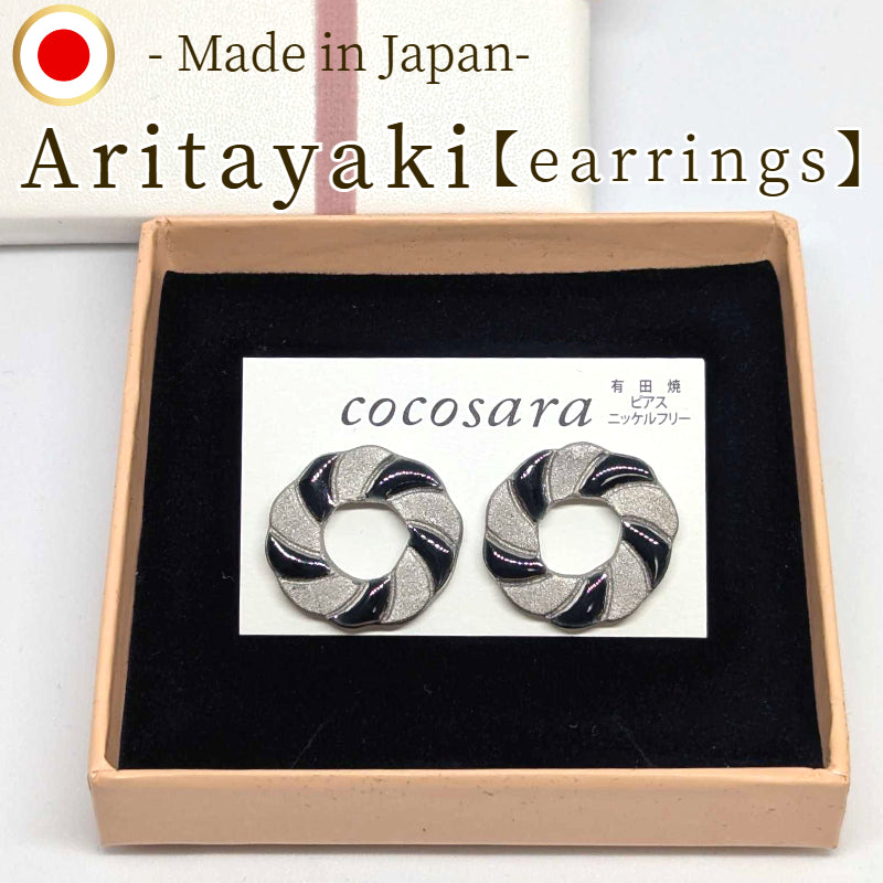 Arita Ware Round Ceramic Earrings | Black & Silver | Handmade in Japan